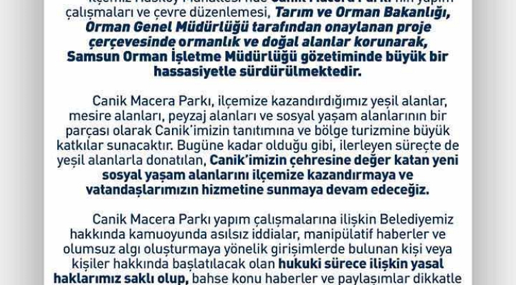 Canik Belediyesi, Macera Parkı ile ilgili iddiaları yalanladı. Belediye tarafından yapılan açıklamada, doğal alanların korunarak hayata geçirelecek Macera Parkı'nın Samsun turizmine katkı sağlayacağına vurgu yapıldı.