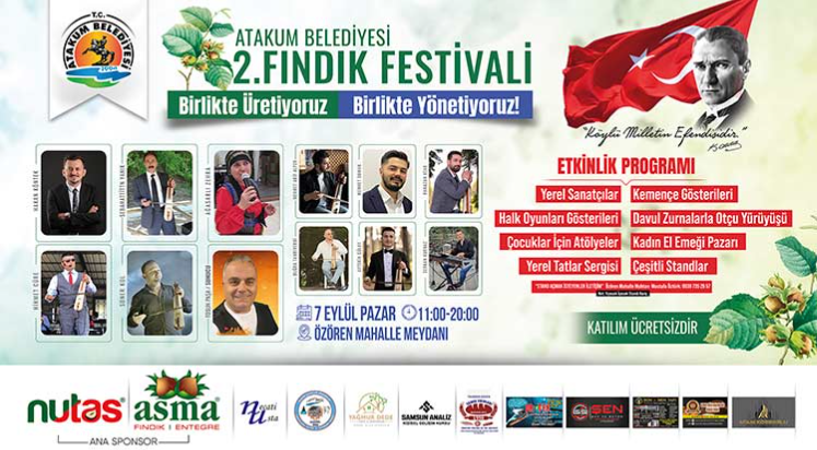 Başkan Türkel öncülüğünde geçen yıl ilki düzenlenen Atakum Belediyesi Fındık Festivali’nin ikincisi Özören Mahallesi’nde gerçekleştirilecek. Festival programı 7 Eylül Pazar günü saat 11.00’de başlıyor.