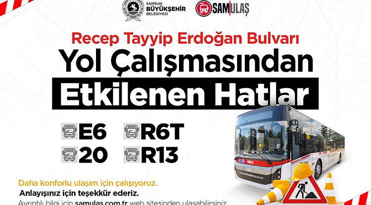 Samsun Büyükşehir Belediyesi tarafından kent içi trafiği rahatlatmak amacıyla şehrin ana ulaşım arterlerinden biri olan Recep Tayyip Erdoğan Bulvarı’nda çalışmalar başlıyor. Büyükşehir Belediyesi, Recep Tayyip Erdoğan Bulvarı’nda başlatılacak dönüşüm çalışmaları nedeniyle bazı otobüs hatlarının güzergâhlarında değişiklikler yaşanacağını bildirerek vatandaşları uyardı.