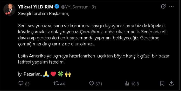 Galatasaray–Samsunspor karşılaşmasının son dakikalarında verilmeyen penaltı pozisyonu, kırmızı-beyazlı camiada ciddi tepki yaratmıştı. Hacıosmanoğlu’nun dün yaptığı “köpeksiz köyde çomaksız dolaşıyorlar" göndermeli açıklamasının ardından Yıldırım, sosyal medyadan esprili cevap verdi.